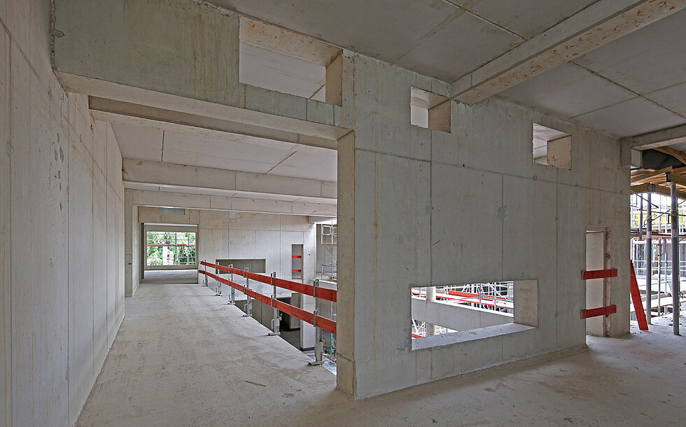 Das Gebäude wird in massiver Bauweise ausgeführt. Im zweigeschossigen Baukörper werden die Geschossdecken als Unterzugsdecken, die von Stahlbetonwänden oder -stützen getragen werden, ausgeführt. Im Bereich des weitgehend stützenfreien Foyers werden die Lasten über wandartige Träger im Oberschoss im Zusammenwirken mit Unterzügen abgetragen. Der eingeschossige Verbindungsbau wird mit einer Gebäudefuge vom zweigeschossigen Baukörper getrennt und als Mauerwerksbau mit linienförmig gestützter Stahlbetonflachdecke ausgeführt. Aufgrund der großen Gebäudelänge ist eine weitere Dehnungsfuge innerhalb des Verbindungsbaus erforderlich. Die Sporthalle wird in Stahlbetonbauweise konzipiert. Die Dachdecke wird von 1,10m hohen Stahlbetonunterzügen getragen.