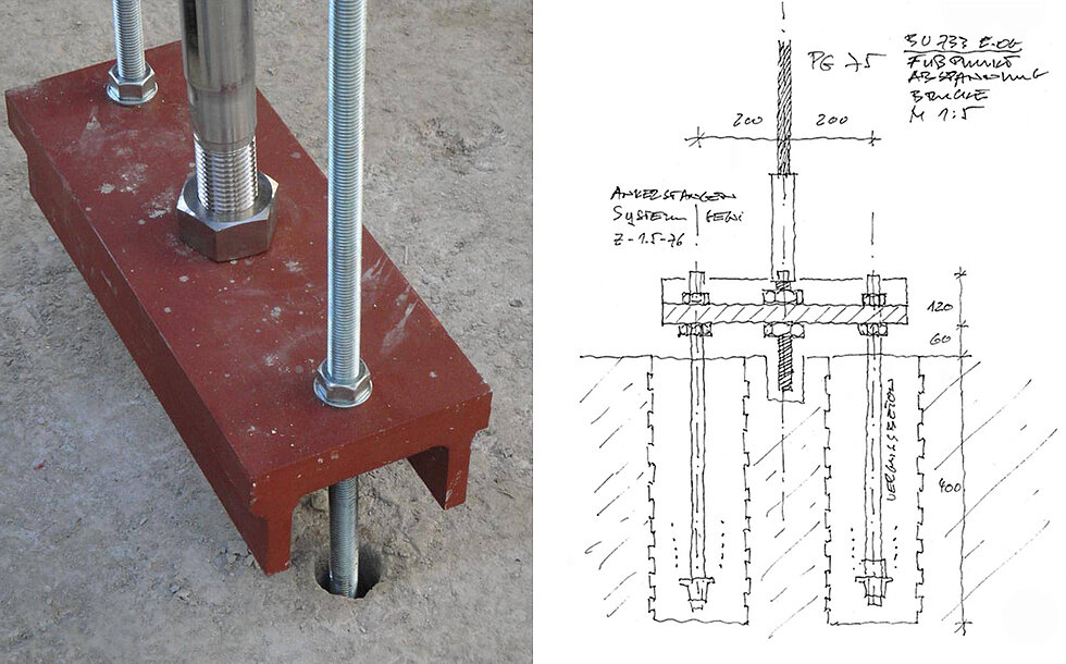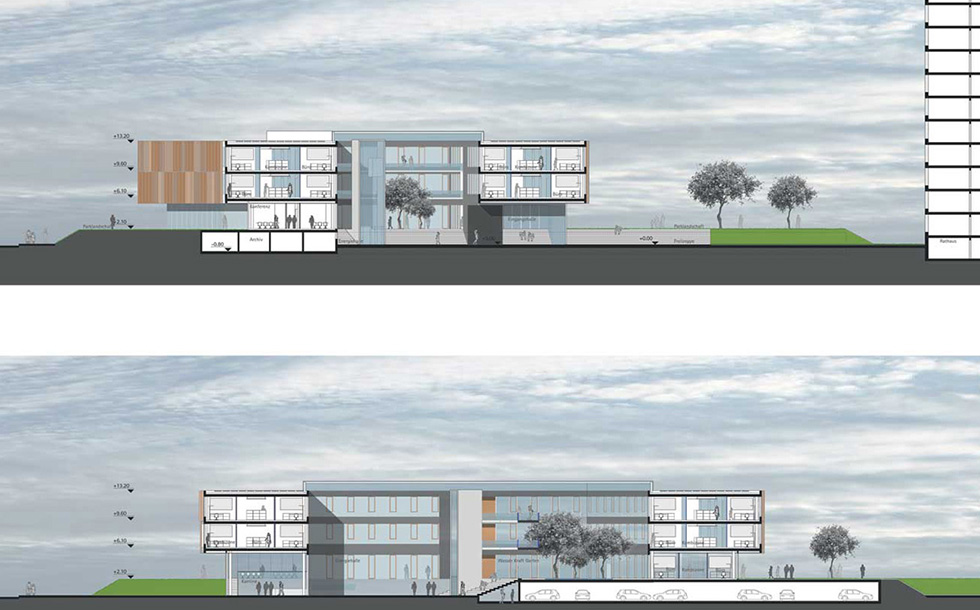 Die Maßnahme gliedert sich in den Verwaltungsbau und die teilweise öffentlich genutzte, erdüberdeckte Garage. Die Primärkonstruktion des Verwaltungsbaues wurde als fugenlose Stahlbetonkonstruktion konzipiert. Die Obergeschosse sind mit punktgestützten Flachdecken ausgeführt. Über dem Erdgeschoss wurde die Deckenkonstruktion mit Stahlverbundträgern ausgeführt, um die überhängenden Bereiche verformungsarm abzutragen. Die Zwangbeanspruchung der Aussteifungskerne infolge des Betonschwindens der Deckenplatten wurde gesondert untersucht und mit den Beanspruchungen des räumlichen Lastabtrages überlagert. Das Atrium wird mit einer Stahlkonstruktion aus geschweißten Stahlkastenträgern überspannt. Die Verbindungsstege sind zur Begrenzung der Schwingungsanfälligkeit mit vorgespannten Seilen abgespannt. Dazu wurden sie als Einfeldträger über die gesamte Hallenbreite bemessen. Im Gebrauchszustand bilden die vorgespannten Seilstützen ein Mittelauflager, so dass die für die Schwingungsuntersuchung wirksame Steifigkeit der eines über zwei Felder durchlaufenden Trägers entspricht.